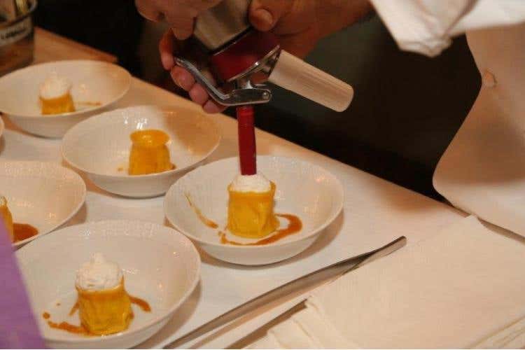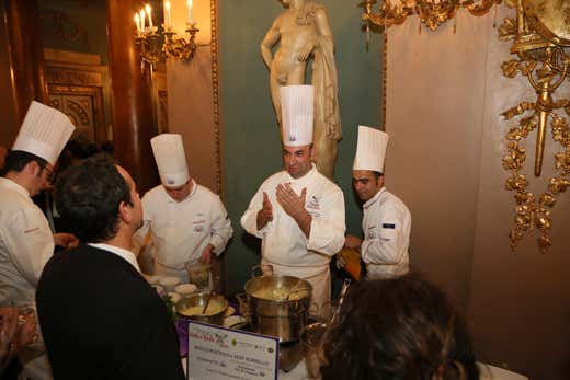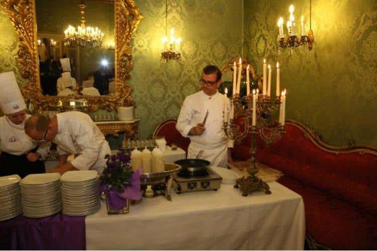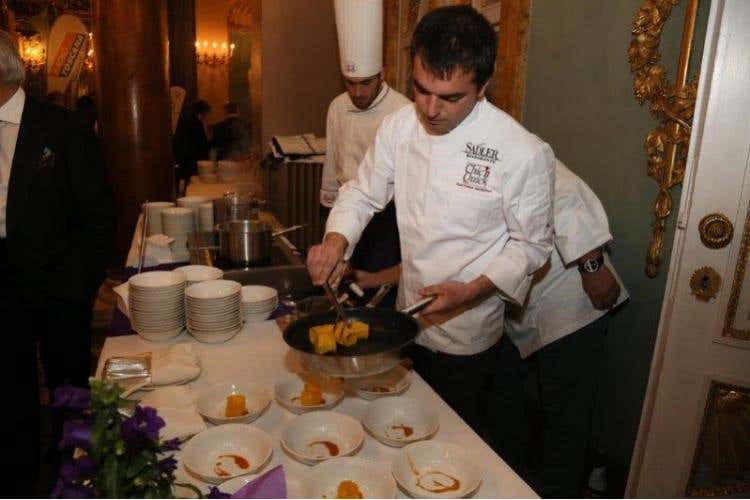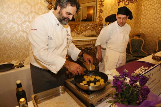 Nella foto: Marco StabileSorta di onor di firma, anche Annie Féolde, tre stelle Michelin, era presente con la sua saporita Pralina di coscia d'anatra con mela verde croccante. Da Firenze a Venezia, zona Mercato di Rialto. A suo pieno agio in postazione, il giovane e già meritatamente famoso il cuoco