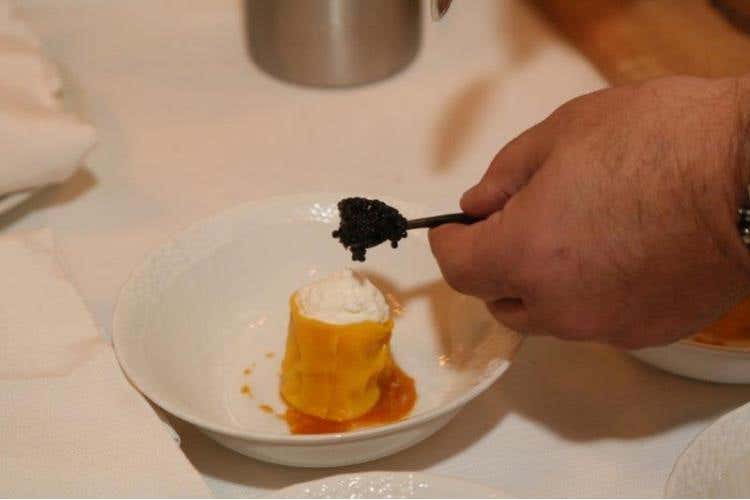 Claudio Sadler. Piatto di grande maestria, il suo: Ravioli di cavolfiore e patate, spuma di latte di capra, olio di ricci di mare e caviale Asetra Calvisius.