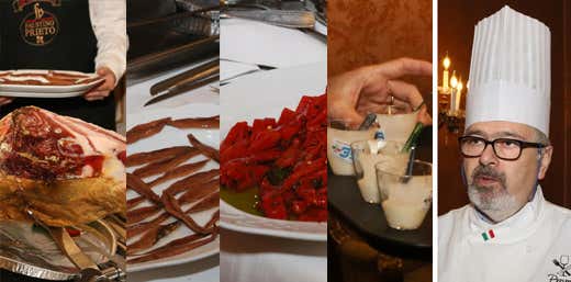 Patanegra, Cecina de León, Acciughe del Cantabrico, Peperoni del Piquillo, Gelato al Grana Padano Riserva 24 mesi, Gelato al pistacchio, mango e nocciola, Gelato alla liquirizia e anice Varnelli, dello chef