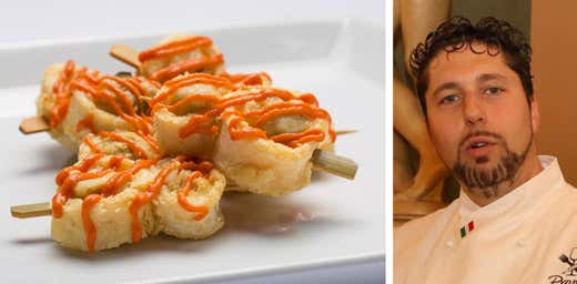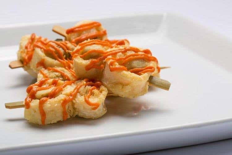 Lo spiedino è realizzato con il calamaro pescato del Mediterraneo, carciofino sott’olio e la particolarità di una salsa all’arrabbiata, fatta con il flan di Valbona e il pesto aglio, olio e peperoncino. Il gustoso piatto è una sorta di rivisitazione del tradizionale “scartosso” di pesce fritto, emblema del ristorante veneziano, in cui i piatti più gettonati nascono proprio dal binomio del pescato del giorno con gli ortaggi.