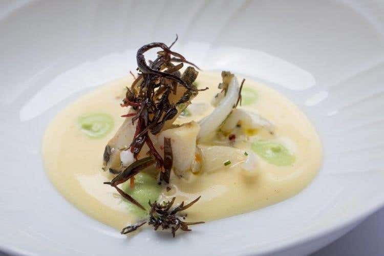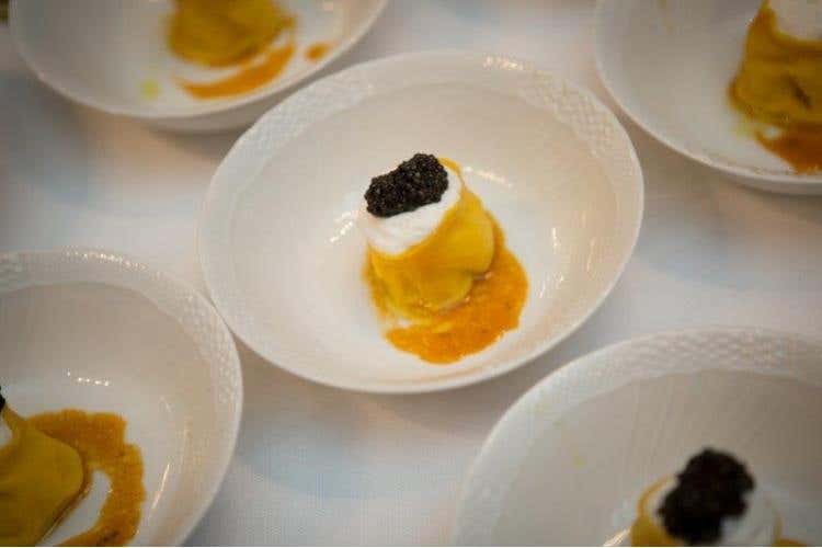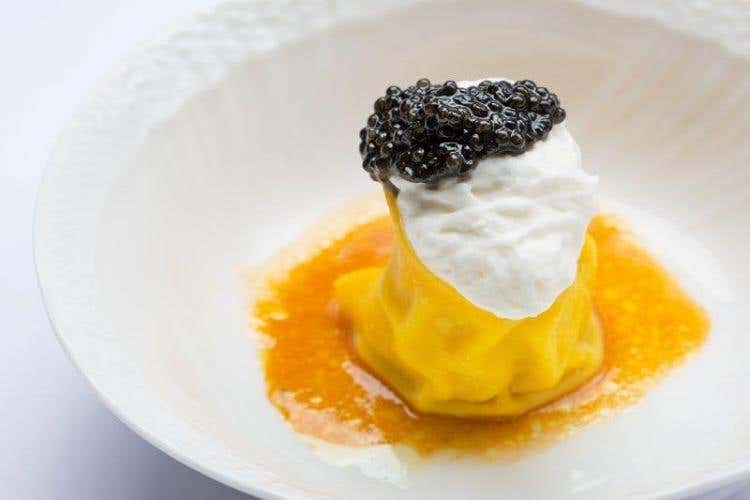 Raviolo di cavolfiore e patata, spuma di latte di capra, olio di ricci di mare e caviale Asetra Calvisius” dello chef