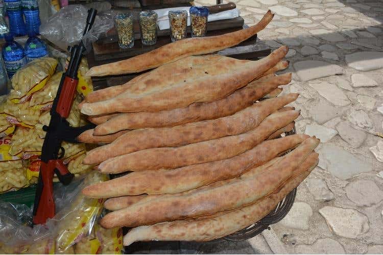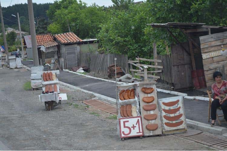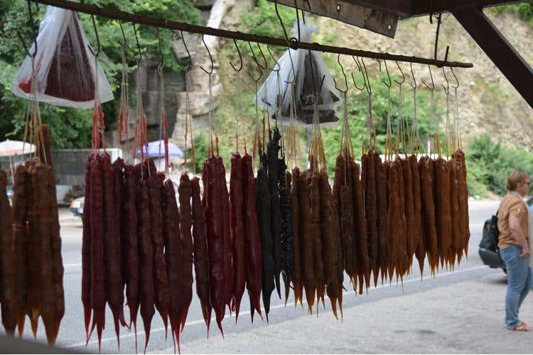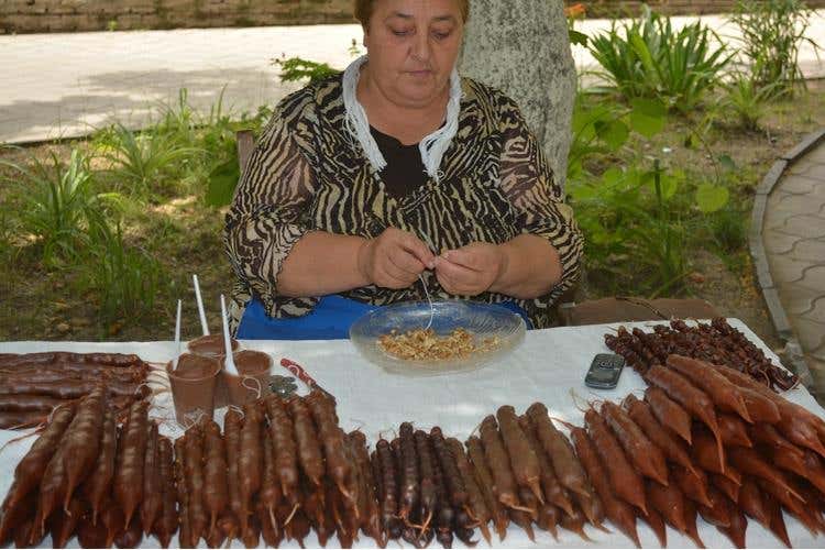 Presidio Slow Food. Anche la produzione delle anfore richiede un lavoro molto impegnativo, sono modellate a mano senza usare il tornio da vasaio e dopo l’asciugatura vengono cotte in speciali forni a legna; attualmente sono solo cinque i vasai in attività. Il viaggio prosegue per la “Georgian wine road” attraversando villaggi dai pittoreschi mercati improvvisati dove in piccole edicole ai margini delle strade troviamo frutta abbondante, in questa stagione mele, pesche, albicocche e mele; il gustoso pane anche nella versione dolce cotto nei forni tandoor; miele e deliziose barrette di noci rivestite di succo d’uva o di frutta. Ogni cantina georgiana è famosa non solo per il suo vino, ma anche per Chacha, una bevanda alcolica molto più forte, simile alla nostra grappa. Una viaggio non facile da affrontare, ma piacevole da scoprire.
