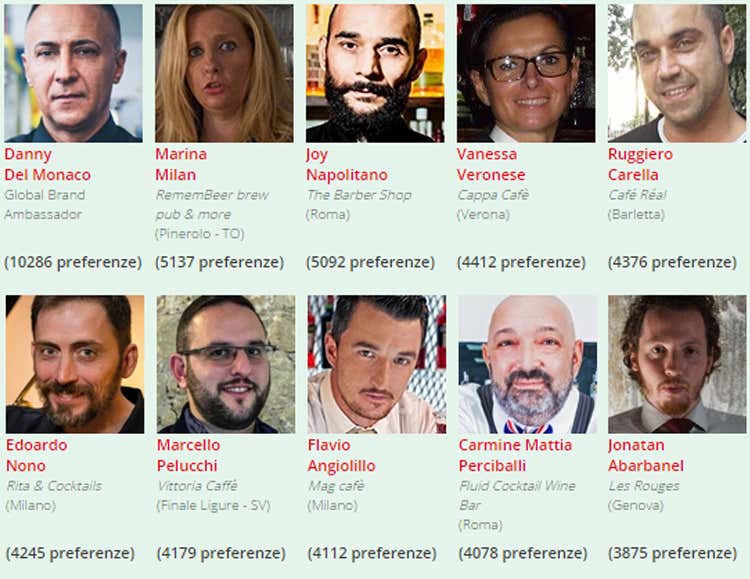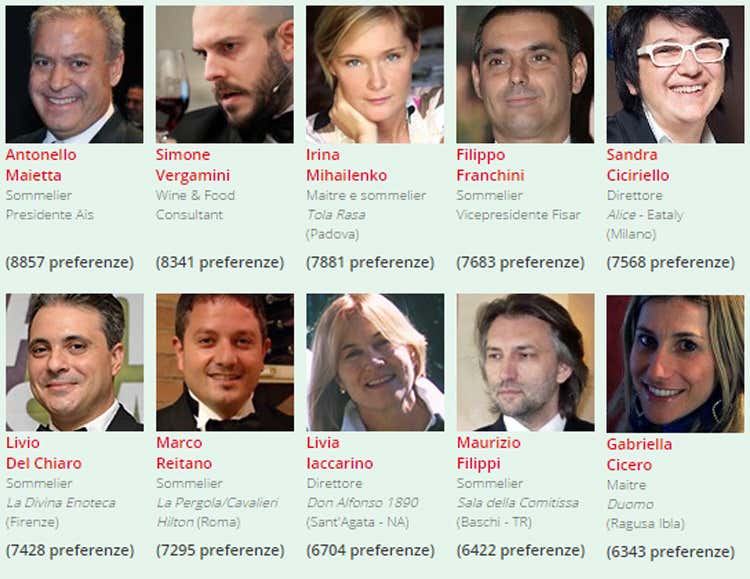 La categoria “Maitre, Sommelier e Manager d’hotel” è stata una delle più avvincenti con tanti candidati che hanno ottenuto un buon numero di voti e risultati incerti fino alla fine. A cominciare da Irina Mihailenko (7.881 voti), maitre e sommelier al Tola Rosa di Padova, che si è piazzata terza davanti al sommelier e vicepresidente Fisar (Federazione italiana sommelier albergatori), Filippo Franchini, che di voti ne ha conquistati 7.683. Poco distante, un centinaio di voti, Sandra Ciciriello, direttore di “Alice - Eataly” a Milano, e alle sue spalle il sommelier de “La divina enoteca” di Firenze Livio Del Chiaro. Chiudono la top ten Marco Reitano (sommelier La Pergola/Cavalieri Hilton), Livia Iaccarino (direttore Don Alfonso 1890), Maurizio Filippi (sommelier della “Sala della Comitissa”) e Gabriella Cicero (Duomo di Ragusa Iblea), prima tra i maitre.