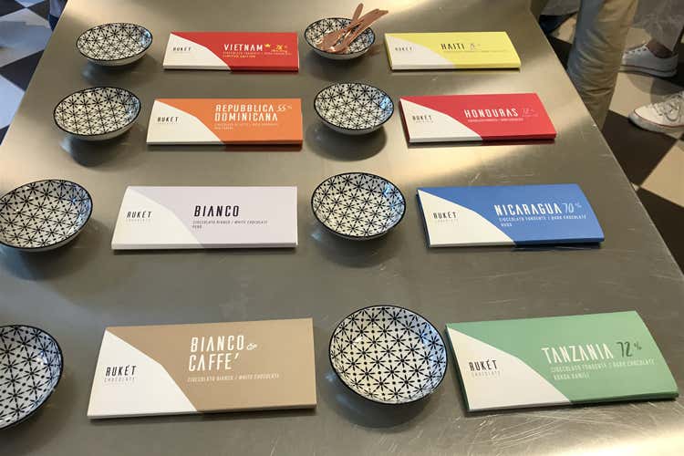 Anche nel loro caso la tracciabilità è completa; è sufficiente leggere le indicazioni sulla confezione per scoprire tutto sulla piantagione di provenienza delle fave, dalla località al tipo di terreno, alla proprietà, alle modalità di coltivazione. Rukét Chocolate propone cinque varietà di cioccolato fondente (Tanzania, Nicaragua, Honduras, Haiti, Vietnam), uno bianco (Perù), uno bianco & caffè (Perù) e uno al latte (Repubblica Dominicana). Ricerca estrema anche nella realizzazione degli stampi. «Li abbiamo fatti fare in Belgio - raccontano - e si ispirano al bugnato del Palazzo dei Diamanti di Ferrara». Territorio sempre e comunque.