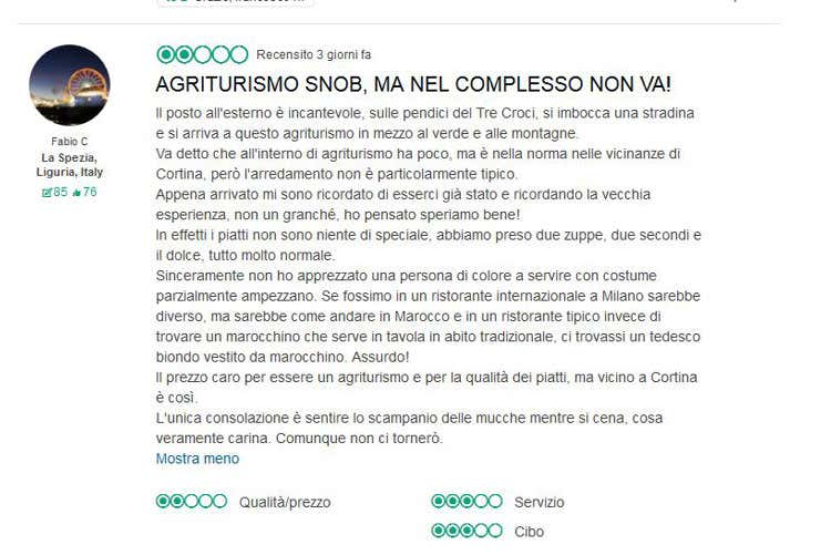 «Non ho apprezzato una persona di colore a servire con costume parzialmente ampezzano - scrive l’utente -. Se fossimo in un ristorante internazionale a Milano sarebbe diverso, ma sarebbe come andare in Marocco e in un ristorante tipico invece di trovare un marocchino che serve in sala ci trovassi un tedesco biondo vestito da marocchino». Giuliana, Ludovica e Riccardo Gaspari, famiglia che gestisce il ristorante hanno letto la recensione e l’hanno immediatamente segnalata al sito web. C’è infatti una sezione dedicata per sottoporre al giudizio dei gestori del portale recensioni «inappropriate, incitazioni all’odio, pregiudizi». TripAdvisor, in modo neanche tanto sorprendente visti i precedenti, ha risposto loro così: «A seguito della segnalazione, abbiamo completato la nostra indagine. La recensione rispetta le nostre linee guida. La nostra community è globale e multi culturale. Proprio perché si tratta di un contesto unico e diversificato, certi modi di dire, termini in gergo o frasi che possono essere considerate ingiuriose per qualcuno, possono non esserlo per altri. Dato che conforme alle nostre linee guida, la recensione rimarrà pubblicata».
