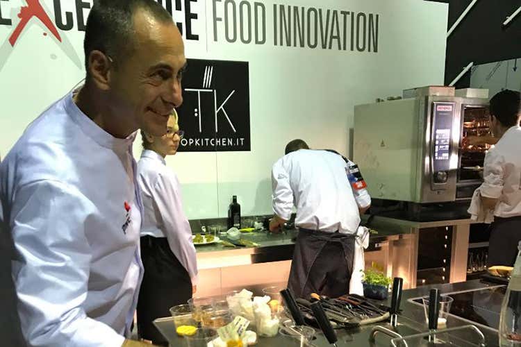 Presa d’assalto la giornata di apertura di sabato 10 novembre, che ha visto protagonisti grandi chef con spettacolari cooking show. Nell’area Next Cooking Lazio una coppia inedita - Caesar Pedresca (Perpetual) e Andrea Quaranta (Ego Bistrot) - ha incantato il pubblico con il piatto “Forma e consistenza di triglia, pera in osmosi allo zafferano e sorbetto di chinotto”. Un accostamento di equilibri e sapori dove la sapidità del pesce nel palato lasciava subito posto alla freschezza delicata del sorbetto in un gioco caldo/freddo con le sfumature gourmand dello zafferano. «Abbiamo voluto giocare sul filo del bilanciamento fra caldo e freddo - spiega Pedresca - un lavoro molto attento che richiede grande preparazione». «La tecnica è fondamentale in cucina - gli fa eco Quaranta - così come l’apporto della scienza. Un’idea che è tradotta nella pratica dalla nostra pera cucinata attraverso l’osmosi».
