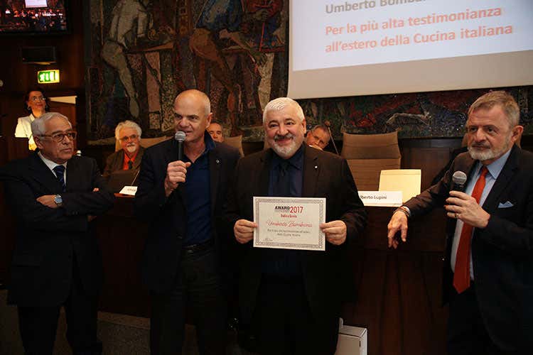 è stato premiato con l'Award Italia a Tavola dal presidente di Euro-Toques Enrico Derflingher. «Credo che - ha sottolineato durante la premiazione il direttore di Italia a Tavola Alberto Lupini - Umberto Bombana sia davvero il campione della Cucina italiana nel mondo». Unico tristellato italiano all'estero, Bombana, come ha ricordato Derflingher, conta oggi 7 stelle Michelin nei suoi locali. A rendere, come ha detto Lupini, «un dovere oltre che un grande piacere» premiare Bombana in questa circostanza è anche la sua origine, di Clusone, proprio in provincia di Bergamo.
