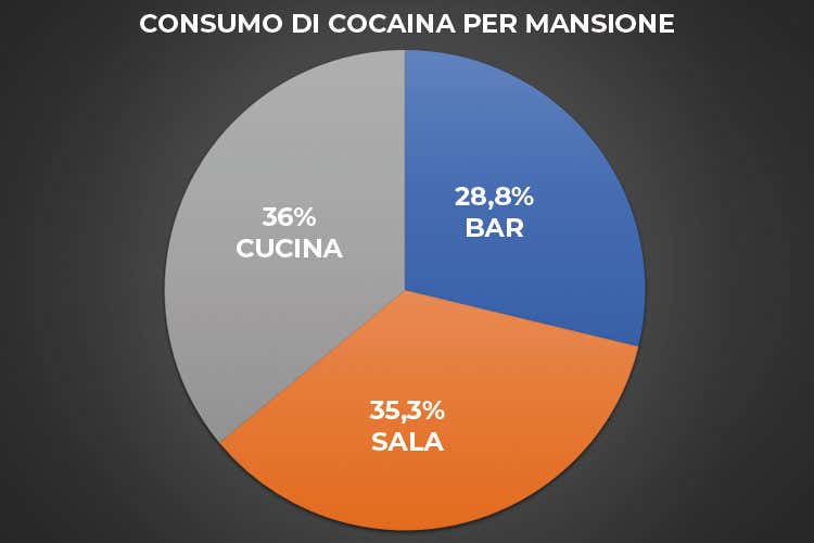 Quali sarebbero quindi i mestieri più colpiti dal vizietto? Quelli che dichiarano di essere consumatori di cocaina, saltuari o abituali, si suddividono in maniera abbastanza omogenea fra personale di cucina (36%), operatori di sala (35,3%) e reparto bar (28%): insomma non dipenderebbe dalle mansioni, quanto probabilmente dalla mole di lavoro.
