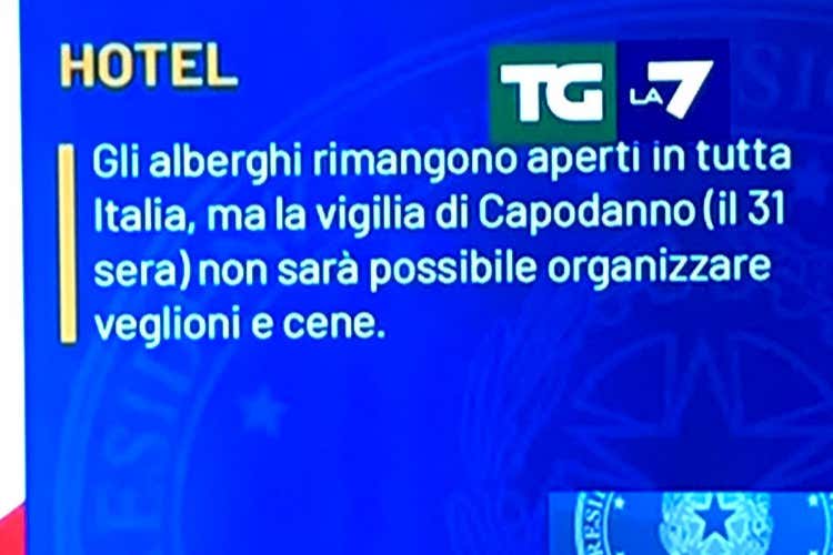 La nuova stretta, la cui notizia era già circolata prima dell’ufficializzazione del Dpcm è quella relativa ai ristoranti d’albergo. Il testo del Dpcm recita: “Resta consentita senza limiti di orario la ristorazione negli alberghi e in altre strutture ricettive limitatamente ai propri clienti, che siano lì alloggiati; dalle ore 18.00 del 31 dicembre 2020 e fino alle ore 7.00 del primo gennaio 2020, la ristorazione negli alberghi e in altre strutture ricettive è consentita solo con servizio in camera».