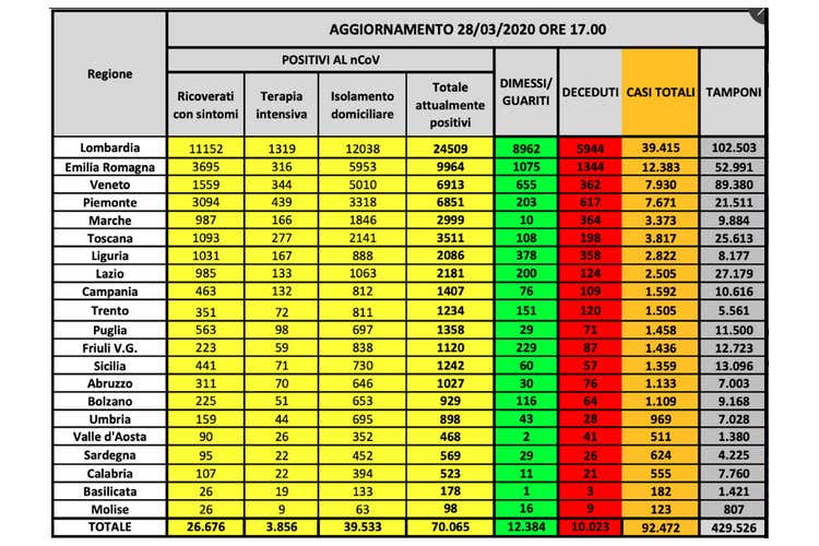 Sono complessivamente 70.065 i malati di coronavirus in Italia. Di questi, 3.858 sono ricoverati in terapia intensiva, 26.676 sono ricoverati in altri reparti di ospedale e 39.533 si trovano in isolamento domiciliare. Il numero complessivo dei contagiati - comprese le vittime e i guariti - ha raggiunto i 92.472. Rispetto a ieri le vittime snoo 889 in più.