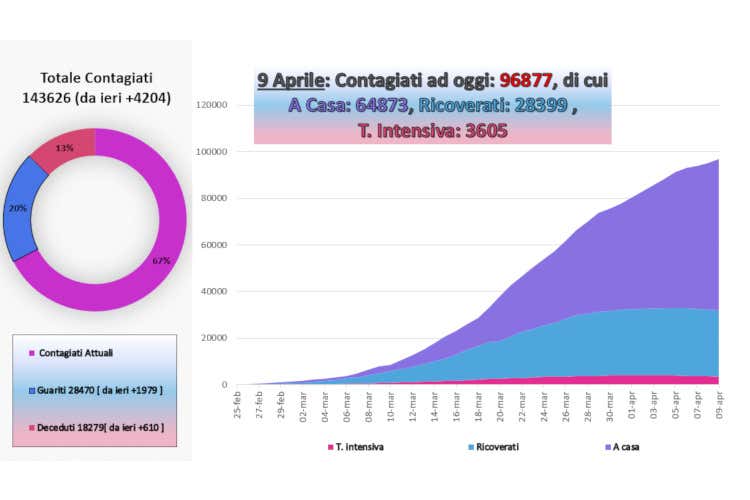 I casi totali di coronavirus registrati fino ad oggi in Italia sono 143.626. Nelle ultime 24 ore si sono registrati 610 decessi (ieri erano 542), di cui 300 in Lombardia. I guariti totali sono 28.470 (1.979 in più rispetto a ieri). Sono 3.605 i pazienti nei reparti di terapia intensiva, 88 in meno rispetto a ieri.