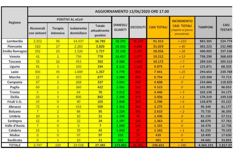 I dati al 13 giugno