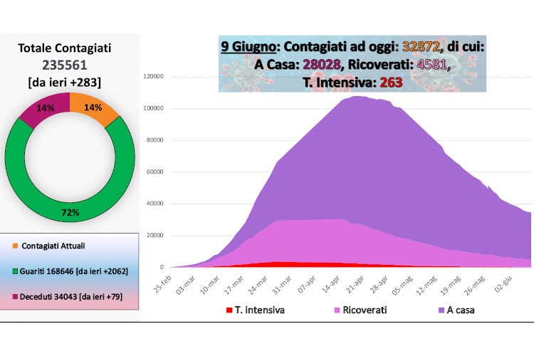 In Italia le persone complessivamente risultate positive al coronavirus, compresi guariti e deceduti, sono 235.561. Le vittime, in totale, sono 34.043, con 79 decessi nelle ultime 24 ore. Il totale dei positivi dall'inizio dell'epidemia, compresi morti e guariti, registra un incremento di 283 casi. I pazienti ricoverati in terapia intensiva sono 20 in meno rispetto a ieri e il totale scende a 263. Nelle ultime 24 ore sono guarite 2.062 persone, in totale sono 168.646. Nell'ultimo giorno sono stati eseguiti 55.003 tamponi. Questi i contagiati in Lombardia, provincia per provincia: Bergamo 13.661 (+52), Brescia 15.094 (+24), Como 3.946 (+11), Cremona 6.505 (+3), Lecco 2.770 (+2), Lodi 3.511 (+9), Monza e Brianza 5.591 (+8), Milano 23.483 (+46), Mantova 3.394 (+4), Pavia 5.423 (+5), Sondrio 1.499 (+7), Varese 3.714 (+14).