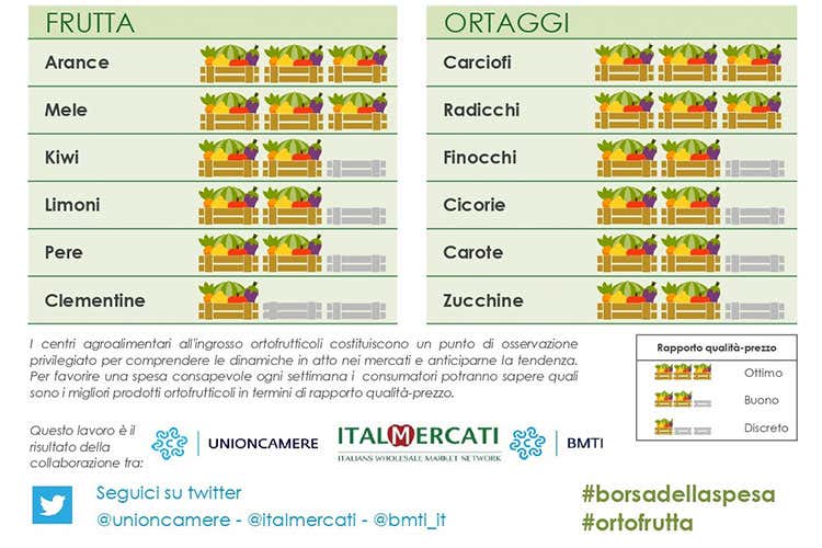 Frutta e ortaggi protagonisti della rilevazione effettuata da Bmti (Borsa merci telematica italiana) relativa alla settimana del 29 gennaio. La "Borsa della spesa" è il servizio offerto ai consumatori dalla società del Sistema camerale italiano per la regolazione, lo sviluppo e la trasparenza del mercato e per la diffusione dei prezzi e dell’informazione economica. Obiettivo, favorire un acquisto consapevole.