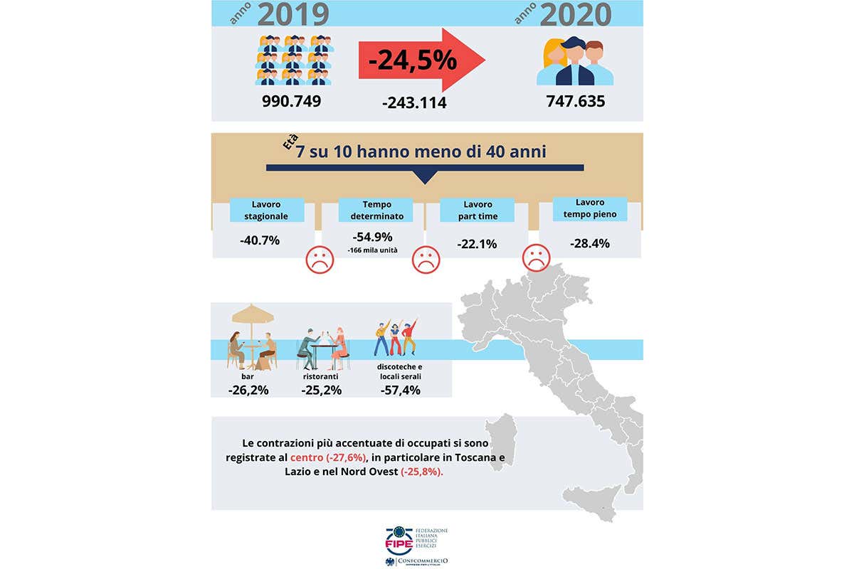 Secondo Fipe-Confcommercio, il settore dei pubblici esercizi ha pagato un conto salatissimo in termini occupazionali: nel 2020 persi 243mila posti di lavoro. Tra i più colpiti i giovani (7 su 10 sono under 40) e gli stagionali. «Le nostre peggiori previsioni si sono avverate. Dopo 160 giorni di chiusura speriamo che questo sia l'ultimo sforzo»