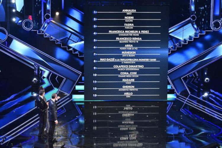 Aiello (Ora): Anche per Aiello è il primo Sanremo e si vede. Si ha la senzazione che non canti benissimo e che sia più preoccupato di come stare sul palco che del risultato canoro. Tuttavia può migliore nel corso delle serate. 6+ di IncoraggiamentoFrancesca Michelin e Fedez (Chiamami per nome): Ci aspettavamo una canzone musicalmente più leggera ammettiamolo. Facciamo mea culpa allora; perchè la canzone è ben strutturata e curata. Fedez regge il palco, lo regge bene e dopo un inizio così così si riscatta anche vocalmente.