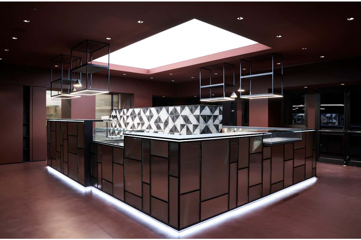 Nella morfologia, come nella ripartizione degli spazi, c’è un richiamo all’osteria tradizionale. Come accadeva in passato, anche all’Osteria Moderna, si viene accolti nell’area “mescita”, che oggi come allora funge da filtro tra chi desidera fermarsi per una breve pausa e chi invece è in cerca di un luogo dove potersi accomodare. Come era tipico delle osterie, la zona ristorazione era nascosta all’occhio del passante, ma soprattutto divisa dall’area bar dove si giocava a carte e si beveva in compagnia. In questo caso, la zona caffetteria è il primo filtro, dotato di angoli snack per il consumatore “mordi e fuggi” che garantiscono comfort anche a chi si ferma soltanto per fare colazione o degustare un tagliere di norcinerie in pausa pranzo. Attraverso un sistema di setti metallici, realizzato su disegno dello studio, si accede quindi all’area ristorante, dove si può consumare un pasto in un’atmosfera elegante e rarefatta, caratterizzata dal colore uniforme dell’ambiente su cui si integrano, con un uso calibrato, quasi come incisi, elementi metallici ed inserti in cemento.