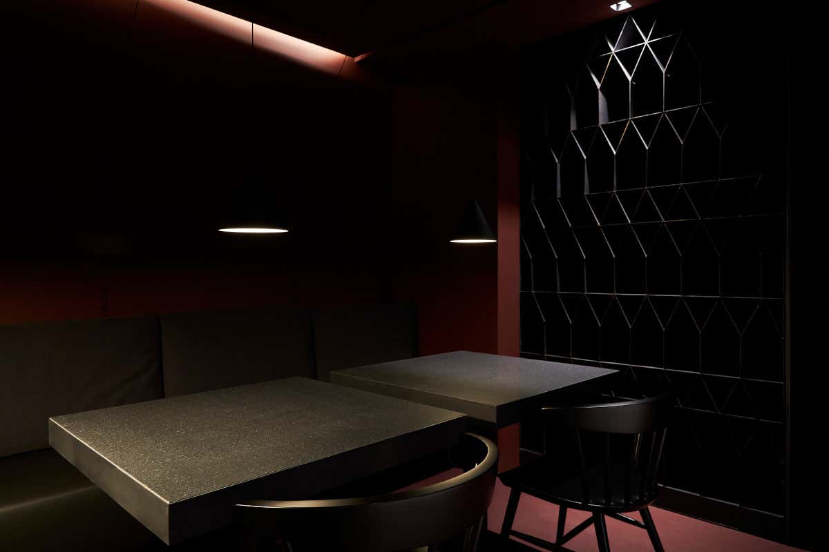 «A volte è bello stupirsi e lasciarsi inebriare da profumi esaltanti, sapori decisi e colori tipici» ed è su questo concetto che è stato pensato l’involucro del locale. Realizzato come fosse una superficie continua, il pavimento è in resina epossidica, con inserti realizzati in graniglia decorata e ad effetto terrazzo alla veneziana, che creano un mix materico-cromatico anticonvenzionale», conclude Svetti. Al centro della area ristorante un tappeto realizzato con cementine su disegno in tre tonalità di grigio crea un’ inaspettata variante cromatica, ma anche un punto di attrazione all’interno dell’ambiente, grazie al contrasto deciso scelto dallo Studio.