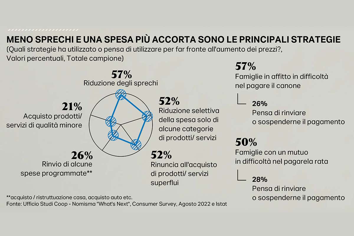 Settore in cui l’inflazione picchia ancora più duramente seppur meno che in altri Paesi europei (da noi un +10% a fronte del +13,7% della Germania). Negli stessi Paesi già si registrano i primi cali nei volumi di vendita che la calda e lunga estate italiana ha per il momento frenato, complici le temperature e il turismo. Eppure in modo anche sorprendente la spending review già in essere degli italiani si concentra su altri comparti, ma non tocca per il momento il cibo; sono 24 milioni e mezzo gli italiani che nonostante l’aumento dei prezzi non sono disposti a scendere a compromessi nelle loro scelte alimentari e nei prossimi mesi prevedono di diminuire la quantità ma non la qualità del loro cibo. Ritorna anche il cooking time sperimentato in lockdown; si passa più tempo nella preparazione dei pasti, ci si impegna a sperimentare nuovi piatti. Il carrello non è più la miniera da cui attingere per finanziare altri consumi, ma un fortino da proteggere rinviando invece quel downgrading degli acquisti a cui si era ricorso in altri momenti di crisi. Al tempo stesso il cibo a cui non si intende rinunciare pare essere soprattutto quello più sobrio e basico, senza orpelli e sovrastrutture; l’italianità e la sostenibilità sono gli elementi imprescindibili che erodono mercato a altre caratteristiche in passato maggiormente considerate. In calo il cibo gourmet, il ready to eat, il biologico e l’etnico. Mentre si profila per la grande distribuzione italiana un futuro denso di incognite, schiacciata da un lato dall’incremento dei prezzi e dal caro energia e dall’altro dalla necessità di attutire l’impatto dei prezzi sui portafogli delle famiglie.