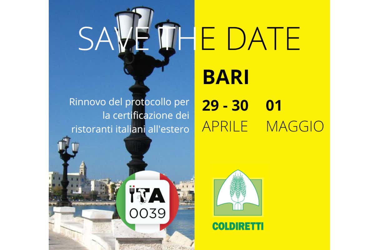 Domenica 30 aprile ITA0039 by ASACERT sarà al Villaggio Coldiretti di Bari per il rinnovo del Protocollo per la tutela dei veri ristoranti all’estero. Alla manifestazione interverranno rappresentanti del Governo e Ministri della Repubblica. A siglare l'accordo, Fabrizio Capaccioli, amministratore delegato di Asacert e ideatore del Protocollo di certificazione, con il presidente di Coldiretti Ettore Prandini.