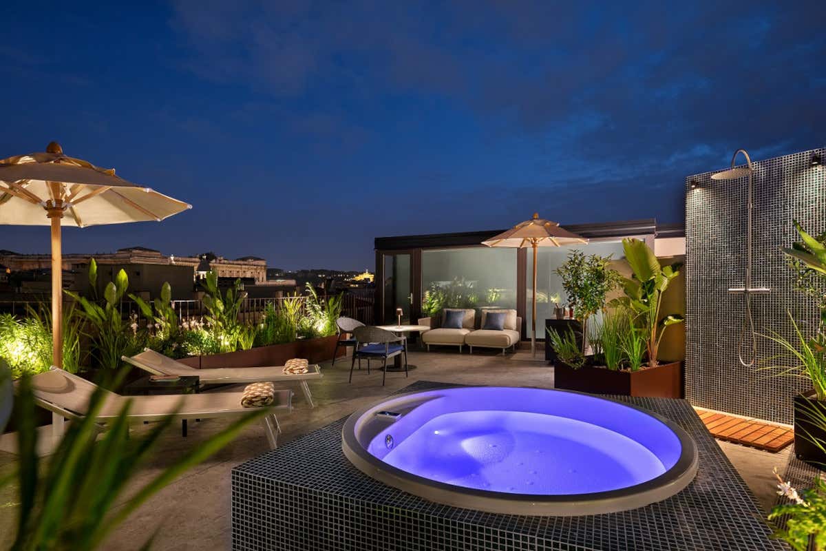 Un solarium, una vasca idromassaggio ed un mobile bar danno vita ad un rooftop privato in cui rilassarsi, dall'alba al tramonto, con musica di sottofondo, sorseggiando un drink o assaporando una deliziosa cena servita dal personale dell'albergo. La terrazza è accessibile tramite una scala a giorno in marmo. Ciascuna suite è poi composta da una spaziosa camera da letto, un guardaroba e uno spogliatoio e un luminoso living con bagno per gli ospiti. Gli ambienti sono insonorizzati, mentre le linee, i colori e le luci giocano con effetti speciali tra l'eleganza degli arredi, in armonica sintesi tra il vintage e il moderno. La tecnologia avanzata del sistema Wi-Fi, degli apparecchi televisivi e dell'impianto sonoro convive con un giradischi all'interno della camera, offrendo agli ospiti l'esperienza dall'ascolto di dischi in vinile.