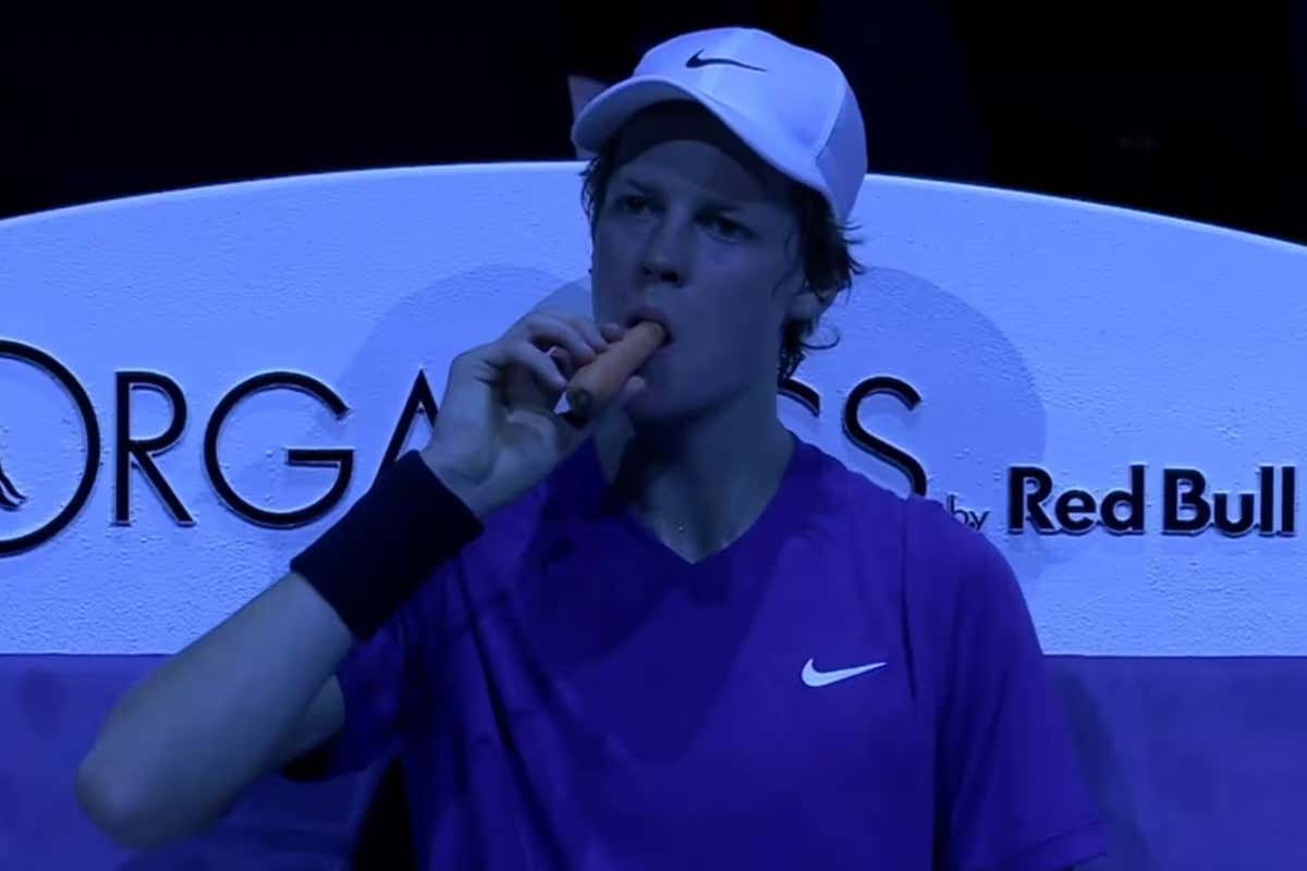 Jannik Sinner mentre mangia una carota durante il cambio campo di una partita (credits: Sky Sport)