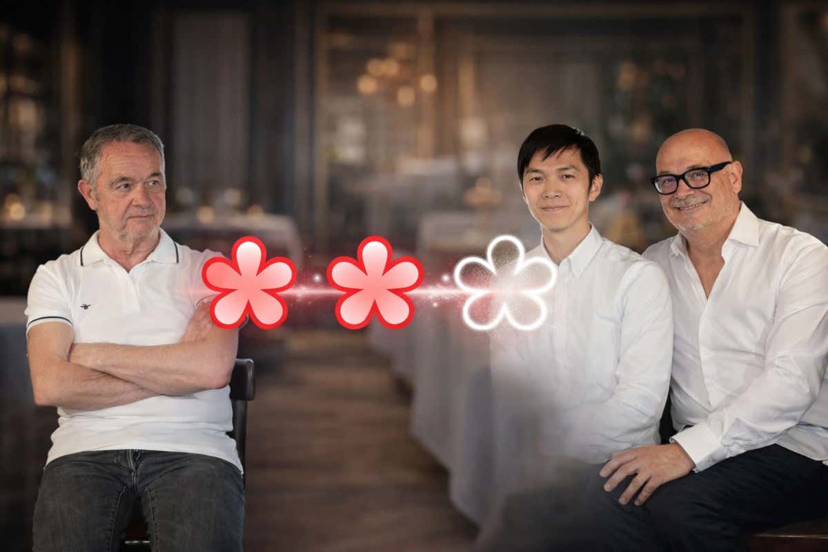 Il proprietario de L'Ambroisie Walter Butler tra gli chef Shintaro Awa e Bernard Pacaud