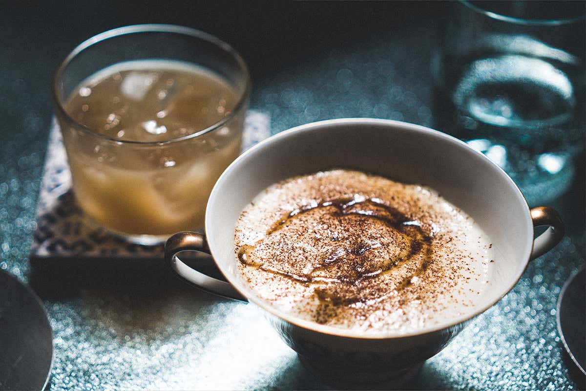 A chiusura "Creme caramel al cavolfiore, lime e menta" e "Winter fashioned - gin, pistacchio, calvados, vermouth cocchi, datteri, caramello". Bel gioco di dolcezza appena accennata ben bilanciato dalla freschezza della menta e dell’erba San Pietro.