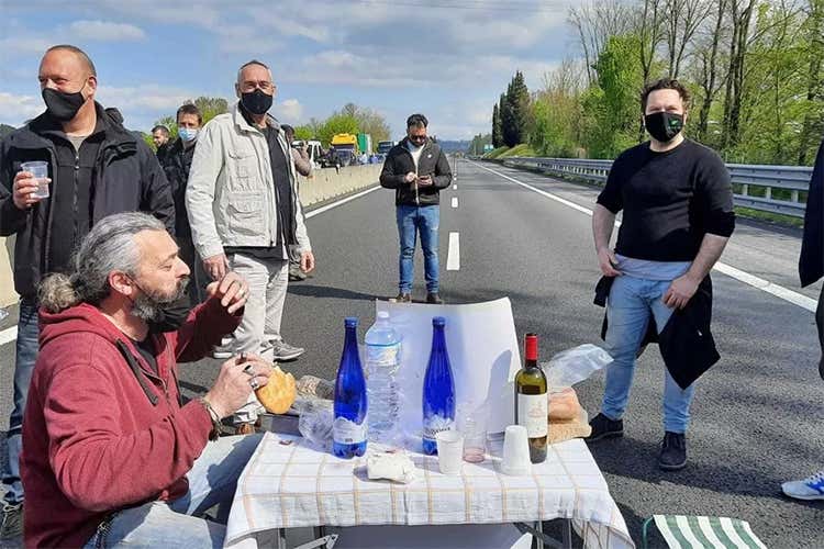 I manifestanti hanno inscenato un pranzo all'aperto sulla corsia autostradale con tanto di tavolo apparecchiato Fonte La Repubblica Firenze