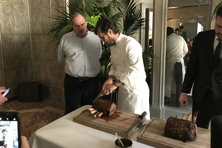 Jeff Martin con Carlo Cracco mentre porziona un carrè di manzo britannico (foto pre-pandemia)