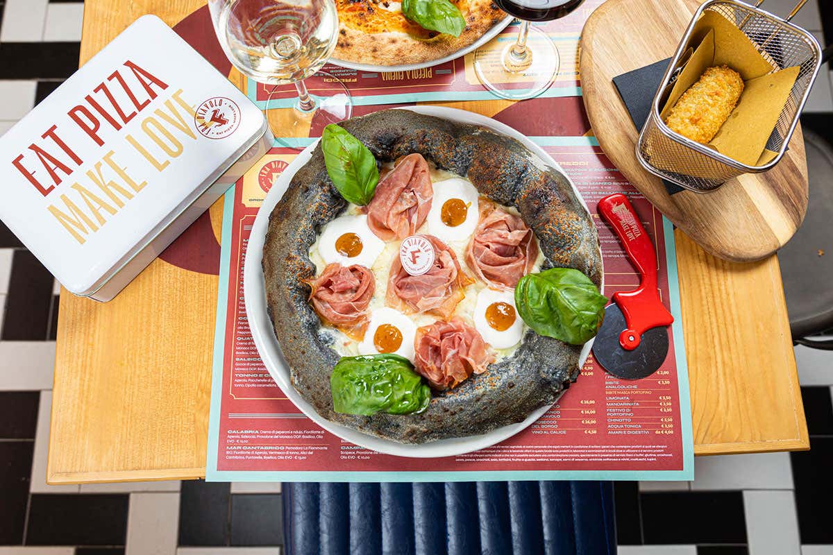 Fra Diavolo di via Genova Thaon di Revel è una pizzeria che gioca con il passato, ma è più che contemporanea. Il processo produttivo è avanzato. Tre gli impasti: classico, multicereali a bassa percentuale di carboidrati e nero, con carbone vegetale in polvere. La cucina madre di Torino li elabora e distribuisce, abbattuti, in tutti i locali.