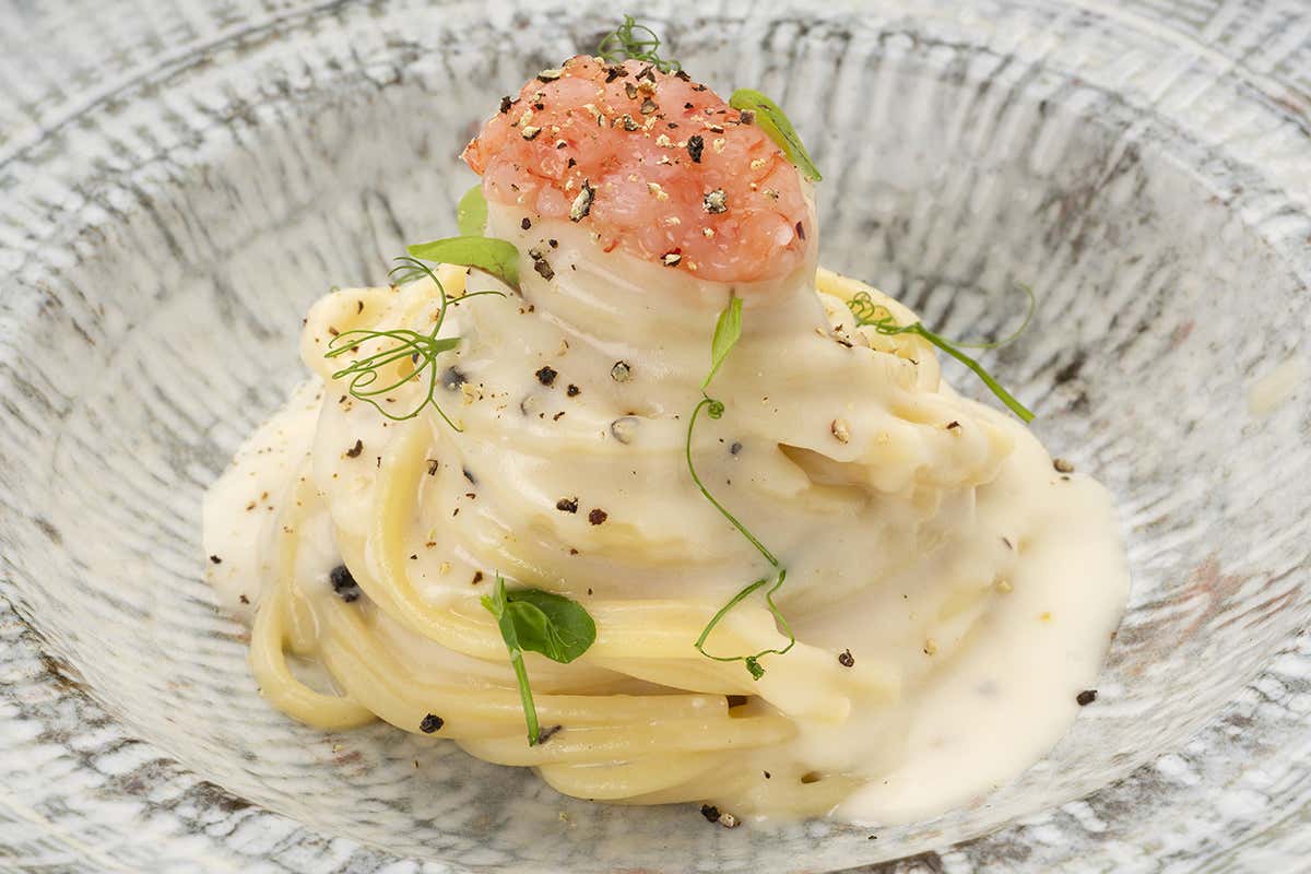 Spaghettone alla cacio e pepe con gamberi di Mazara Giuseppe Di Iorio: «Amo la consistenza nel piatto»