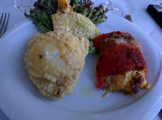 Qui, vorremmo aggiungere, oltre al quasi km zero, c'è il “freezer zero”. Coraggiosa, encomiabile scelta del patron. Professionale, in understatement, l'attenzione alle stagioni. Gioiosamente fittizia la presenza della carta, fiduciario e ben riposto l'approccio, ci si affida al competente personale di sala. L'antepasto intriga: fiore di zucca pastellato con farcia costituita da saporita ricotta di Agerola; mozzarella in carrozza, filante come golosamente ci si attende che sia, robusto peperone ripieno: delizia per il palato.