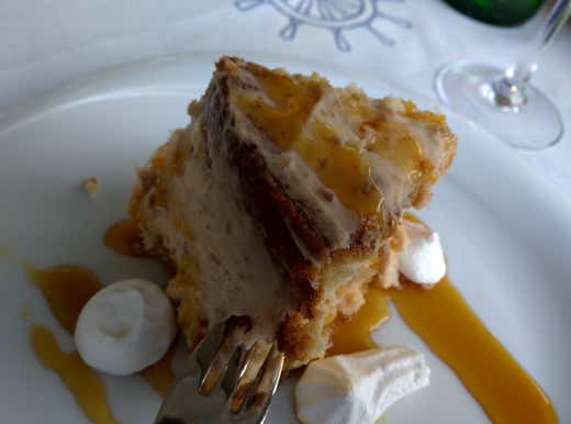 E dopo mezza pizza margherita, e mezzo calice di Biancolella, potrebbe non essere il momento di un eccellente primo piatto? E, stante la navigata maestria dello chef, potrebbe non risultare eccellente un primo piatto dove la pasta è data dai pennoni rigati del Pastificio Gentile ed il pesce che il tutto nobilita è un coccio freschissimo? Doviziosa la pesca, pesante la rete, altro coccio freschissimo sostanzia ottimo secondo, impeccabilmente eseguito: il coccio all'acqua pazza. E siamo al dolce. In sembianza di torta, corpulenta la rivisitazione, originale l'interpretazione: ecco a noi il marron glacé. Ci piace.