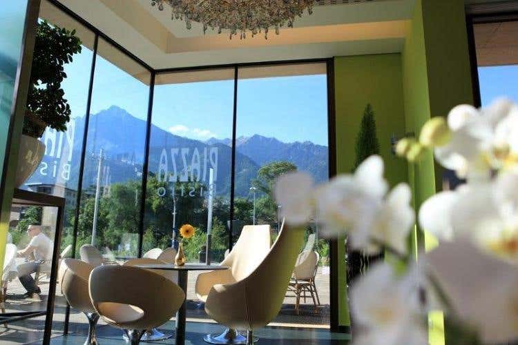 I momenti conviviali possono essere vissuti anche nel Bistro La Piazza progettato dall’architetto Hugo Demetz. Il cubo di vetro con menu gustosi e vista a tutto tondo nel centro della Piazza delle Terme.