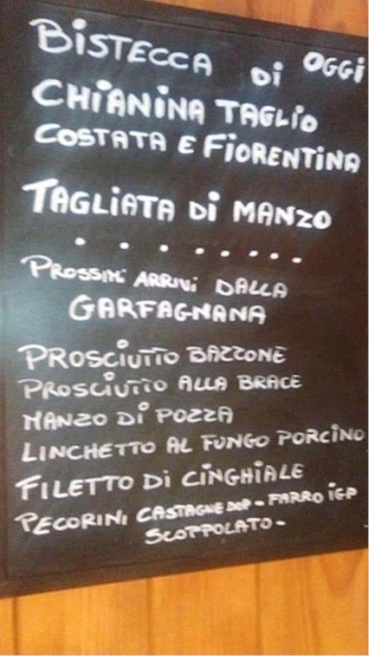 Quanto alle proposte della cucina, qui entrano solo carne di Chianina certificata dal Consorzio di tutela; i salumi e formaggi sono tipici di Pienza e della Garfagnana: con questi prodotti, che Massimo va ad acquistare direttamente sui luoghi di produzione, si preparano succulenti taglieri, hamburger, carpacci di carni sceltissime, schiacciate. La tipicità si amplia talvolta a piatti tipici come “pasta e ceci” o la “ribollita”, ma a dominare la scena, insieme ai tanti variegati taglieri, ecco la tagliata di manzo e la superba “Bistecca di Chianina, vitellone bianco dell’Appennino centrale”.