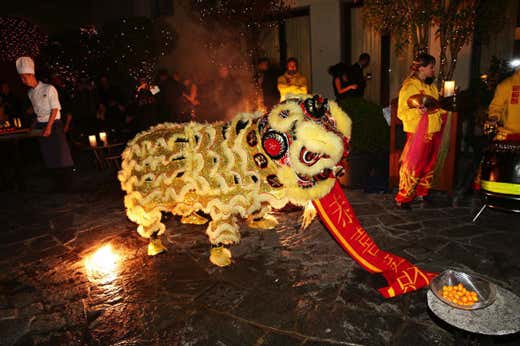 Momento clou della serata è stata la “Danza del leone”, una danza tradizionale cinese che porta fortuna e benessere in quanto il leone è considerato animale sacro che con i suoi poteri scaccia il male. Il leone, interpretato da artisti marziali e acrobati, è comparso a sorpresa nella corte del Mandarin Bar anticipato da un fragore di petardi e, dopo aver svolto la sua sinuosa danza accompagnato dal suono di percussioni, piatti e gong, ha reso omaggio al nuovo anno lunare, l’anno della Scimmia, inchinandosi di fronte a una grande scimmia di cioccolato portata in trionfo dagli chef.