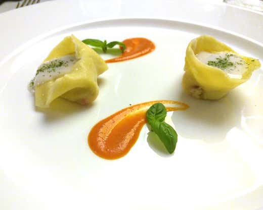 Tortello all'uovo ripieno di Carciofo Igp di Paestum e gamberi rossi di Policastro su specchio di pomodorino datterino
