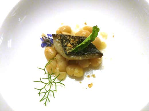 Villeggianti che possono optare per pranzo da consumare al beach restaurant oppure nel resort. Momento imperdibile, dopo giornata ben spesa, la cena. Locale molto elegante, servizio celere e professionale. Maitre di grande esperienza. Si comincia con Zuppetta di Controne con sgombro alla mentuccia e germogli di borragine. “Controne”, paesino del Cilento, qui sta ad indicare, in tacita omissione, il “fagiolo di Controne”, piccolo, rotondo, bianchissimo, Presidio Slow Food, semplicemente squisito!