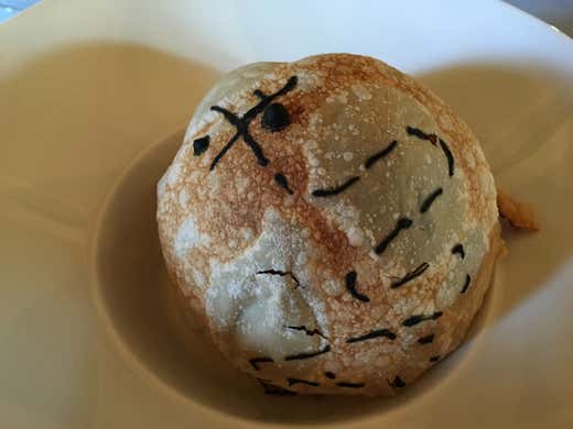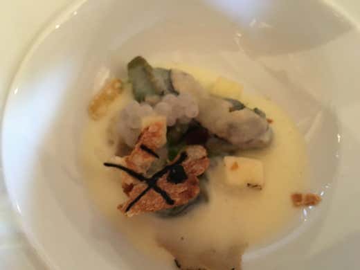 Caccia al tesoroConclude l'incipit della carta la “Caccia al tesoro”: una crosta alla cipolla soffiata, con crema di patate e aglio, del tartufo, lumache biologiche (nutrite con bietola e lattuga) dalla Romagna glassate al prezzemolo e le loro uova, mele di Ponte al calvados. Un piatto in cui la tecnica, per gonfiare la sfera di crosta che contiene le lumache, si sposa con l'equilibrio dei sapori. In accompagnamento ai primi tre piatti un Domasino 2014 Terre Lariane dell'