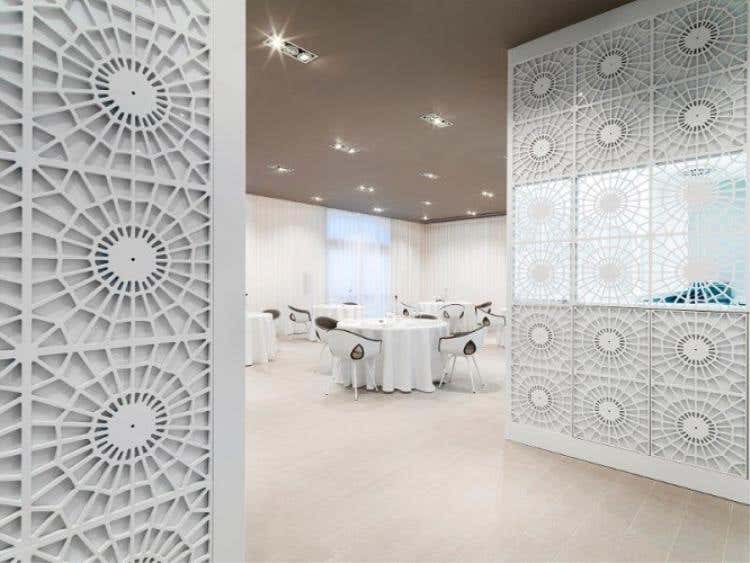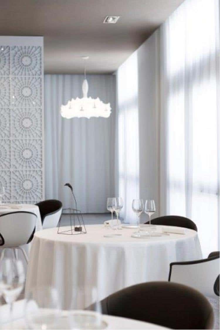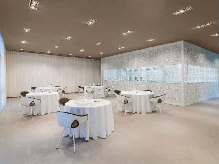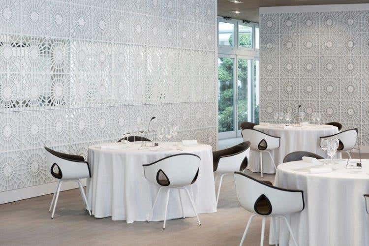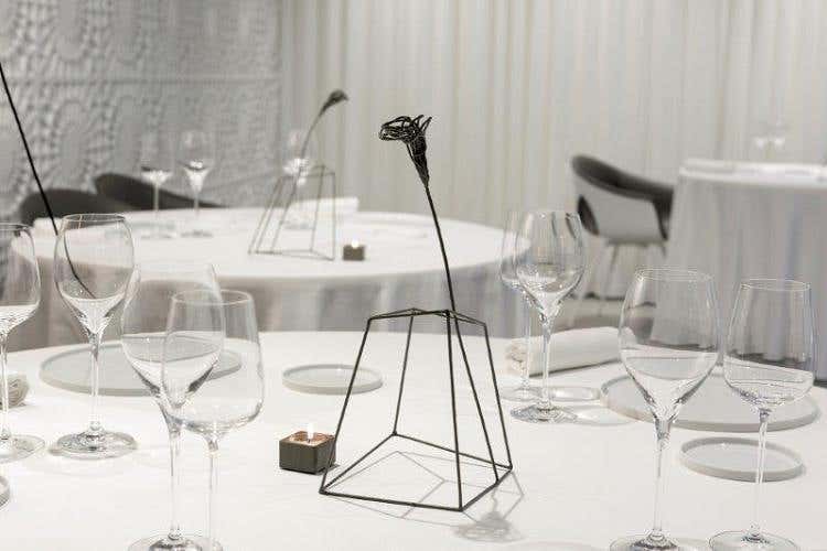 Il progetto è a cura dell’architetto Monica Melotti, che ha studiato la ristrutturazione e il design degli interni. La cucina, protagonista dello spazio, è racchiusa in un cubo di vetro rivestito da decori ricamati che danno vita a un gioco di volumi di estremo fascino. Elemento centrale di grande impatto, si fonde armoniosamente con la sala permettendo agli ospiti di intravedere cosa accade all’interno.