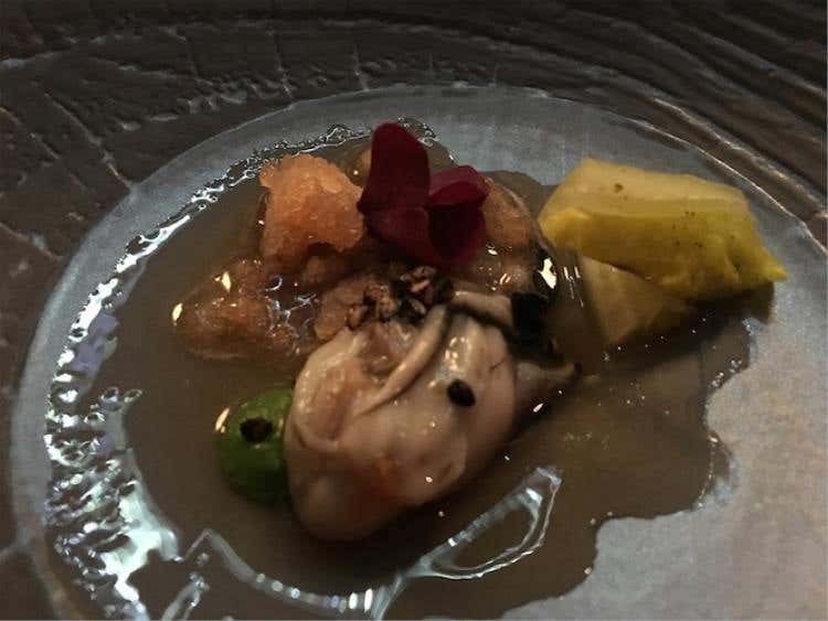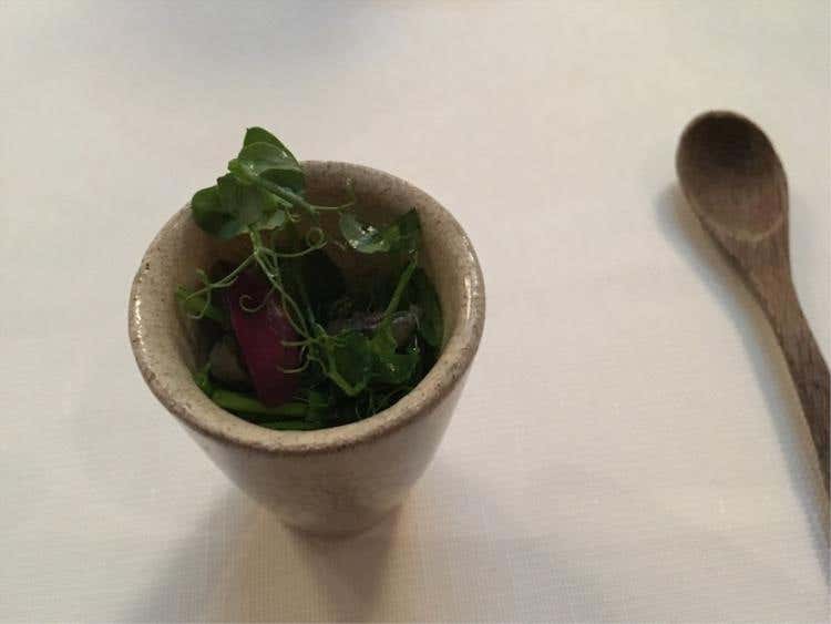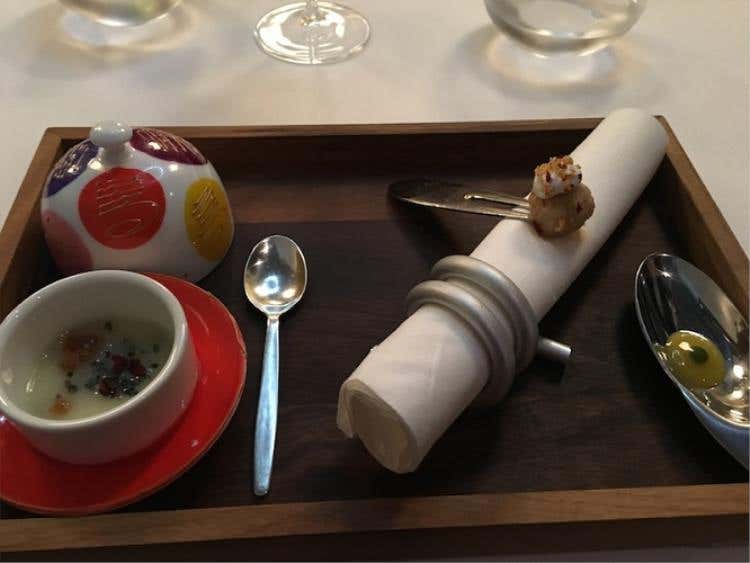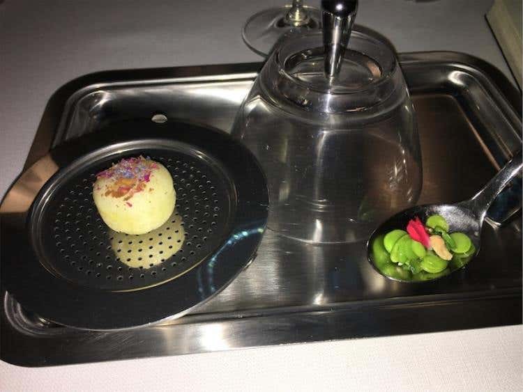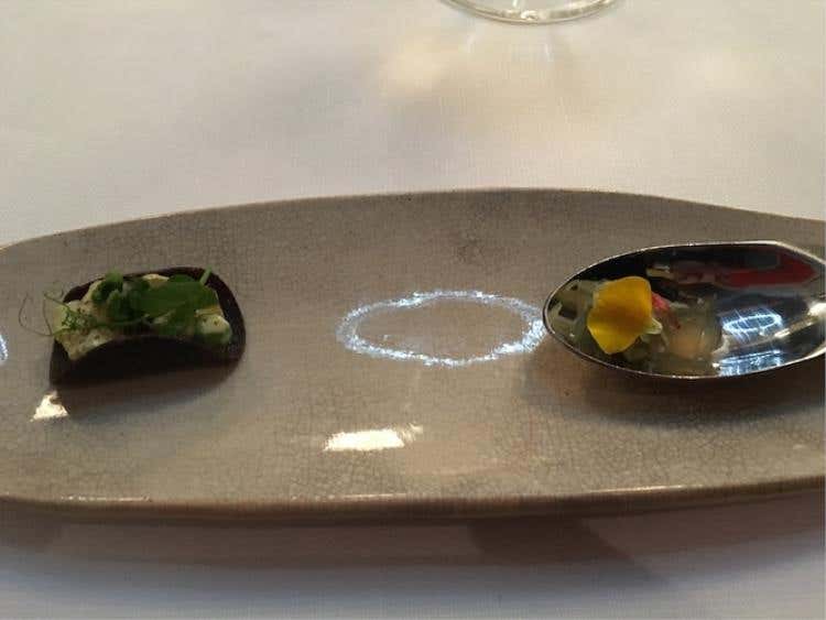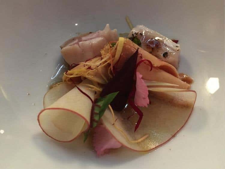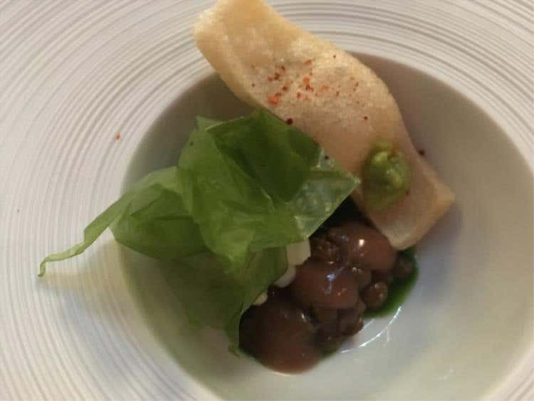 Coda di rospo, porro, limone e kombuSi parte con un'equilibrata Crema di patate, uova di salmone e anguilla dove sapidità e dolcezza si contrastano. Il Baccalà con quinoa e salsa di mango e coriandolo è una vera sopresa per fragranza, mentre quasi inaspettato è il gusto della Spuma di ceci, acciughe e cetriolo, frutto di un'indovinato mix di aromi. La Cialda di pane all’essenza di origano, la Polvere di funghi e gel di limone e fave, come il Panino al vapore con salsa alle rose sono frutto di ricerca, estro e gusto non comuni, come il Tacos di riso venere con insalata russa e maionese di tonno.