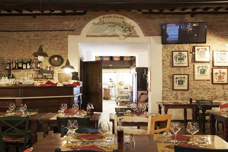Sapori autentici, modi garbati, atmosfera familiare: queste sono le caratteristiche che distinguono il ristorante Fonte Giusta dai tanti locali nati come funghi negli ultimi anni nel senese. Ubicato nel centro storico della città del palio, a soli circa 500 metri da piazza del Campo, il ristorante dispone di una grande sala arredata con semplicità, nel classico stile toscano, ma ricca di atmosfera, grazia e personalità. Doti che sono nel Dna di Angela, figlia del celebre pittore Antonio Faccioli, al ricordo di cui “babbo” ha allestito all’interno del ristorante una mostra permanente e inventato le “tavolagliette d’autore” stampate ogni anno con immagini diverse correlate da aforismi, cenni storici, barzellette o vecchi modi di dire, il tutto per far sorridere la clientela e fargli ricordare la sosta nel loro locale.