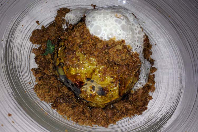 Si comincia con un gradito benvenuto del cuoco. Pasquale incamicia la patata interrata del Taburno (montagna del Sannio) in petali di tartufo nero di Ceppaloni (Ceppaloni, nel Sannio, è città del tartufo) su cui aleggia aria di Pecorino di Carmasciano (siamo nella contigua Irpinia) e crumble di sottobosco Funge da saporito giaciglio la fonduta di Pecorino di Carmasciano. Nel calice un vigoroso aglianico, il Don Enzo, omaggio al papà di Dionisio.