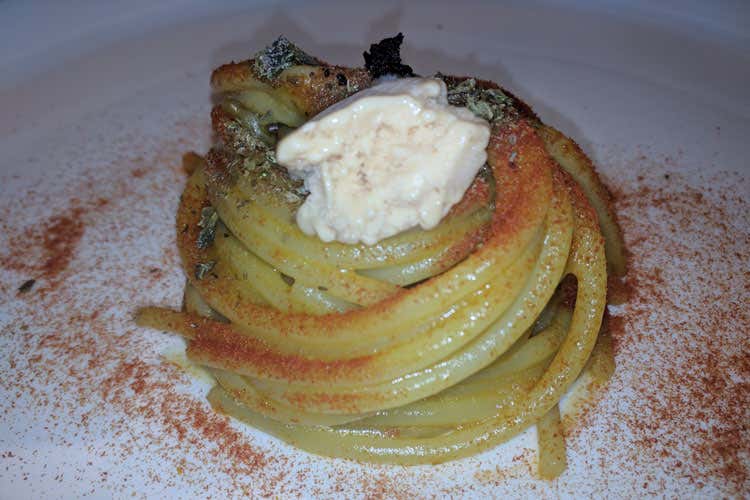 Due i primi. Si comincia con Tortelli ripieni di minestra maritata con terrina di punta di petto e consommé di cappone. Davvero talentuosa l’idea di far divenire farcia di tortello l’essenza di gustosa minestra maritata. Su questa pietanza e sulla successiva, nei calici, grande la competenza del sommelier, il Fiano Roccomanfina 2015 Zagreo, dell’azienda vitivinicola Cacciagalli. Da sole uve fiano è affinato 8 mesi in anfora e 6 mesi in bottiglia. E giunge in tavola, graditissimo, altra creazione dello chef Stefano Del Vecchio: Spaghettone Leonessa ai ricci di mare con puttanesca disidratata. Ecco, avere in dotazione i migliori prodotti, gli spaghettoni Leonessa nel caso di specie, e saperli utilizzare mediante tocchi creativi che sanno poggiare non sono sull’estro bensì, condizione necessaria, anche su collaudate tecniche.