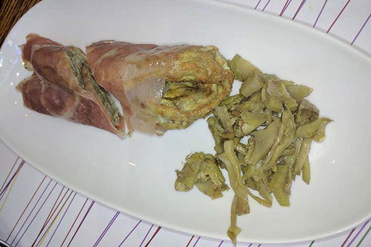 Si comincia con deliziosa Frittata di carciofi avvolta in Prosciutto di Sauris Igp. Nel calice, scoperta gradevole, Stradabianca Igt Lazio by Colacicchi (azienda vitivinicola in quel di Anagni, di proprietà della famiglia Trimani). Beverino e gagliardo, duttile, da uvaggio di malvasia puntinata, passerina, bellone.