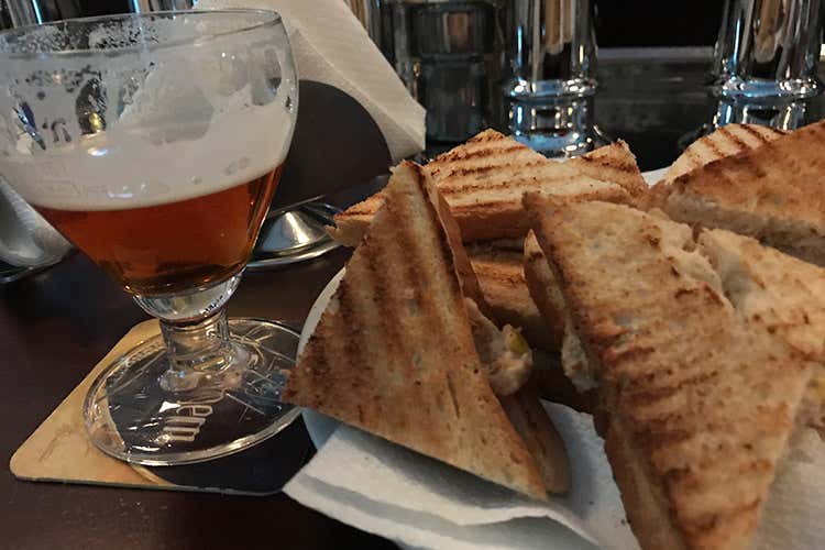 Per non rimanere sul piano meramente teorico-divulgativo, nel corso della presentazione del libro, la piccola cucina di Brasserie Bruxelles ha servito Toast con tonno, mais e maionese e con salame piccante. Birre belghe in abbinamento, ça va sans dire.