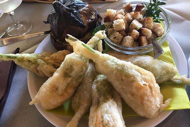 Anche il pane viene prodotto dalla cucina; quello di semola all’olio extravergine d’oliva e quello di semola e patate hanno accompagnato gli antipasti buonissimi e presentati coreograficamente: Prosciutto crudo sardo e fichi d’india, Ricotta e saba, Zucchina in crema aromatizzata al limone, Polpettone di patate alle erbe aromatiche, Zucchine e riso venere, Fiori di zucca in pastella, Fegatini a ghisadu. E naturalmente la Melanzana in crema di mentuccia, «È da 12 anni che questo piatto ci rappresenta - ha raccontato Alessia Mura - è un piatto che abbiamo ideato noi, insieme a tanti altri certo, ma credo che la melanzana alla mentuccia insieme al porceddu sia uno dei nostri cavalli di battaglia».