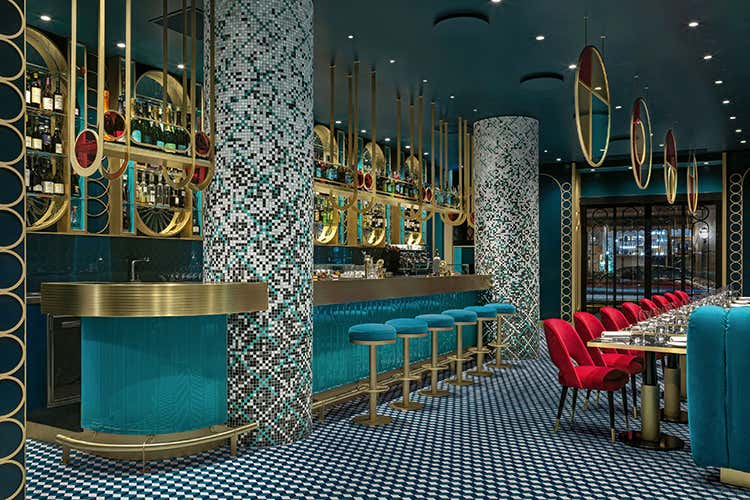 Fregi sottili e arcuati che avvolgono lo spazio, esili strutture metalliche incorniciano elementi trasparenti colorati, mentre grandi colonne rivestite in mosaico trafiggono il lungo bancone dal rivestimento in vetro diamantato turchese secondo uno stile eclettico ed innovativo, dal sapore contemporaneo.