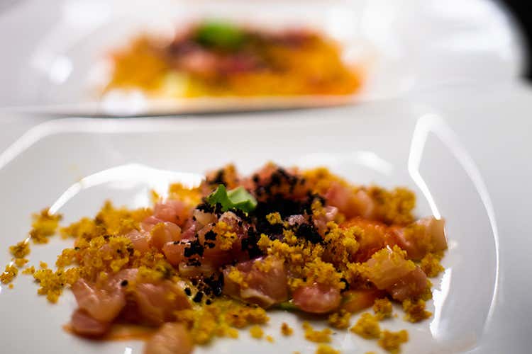 Ricciola in tartare con carpaccio di pomodori, basilico e polvere di olive (Al Carroponte accoglie l'autunno